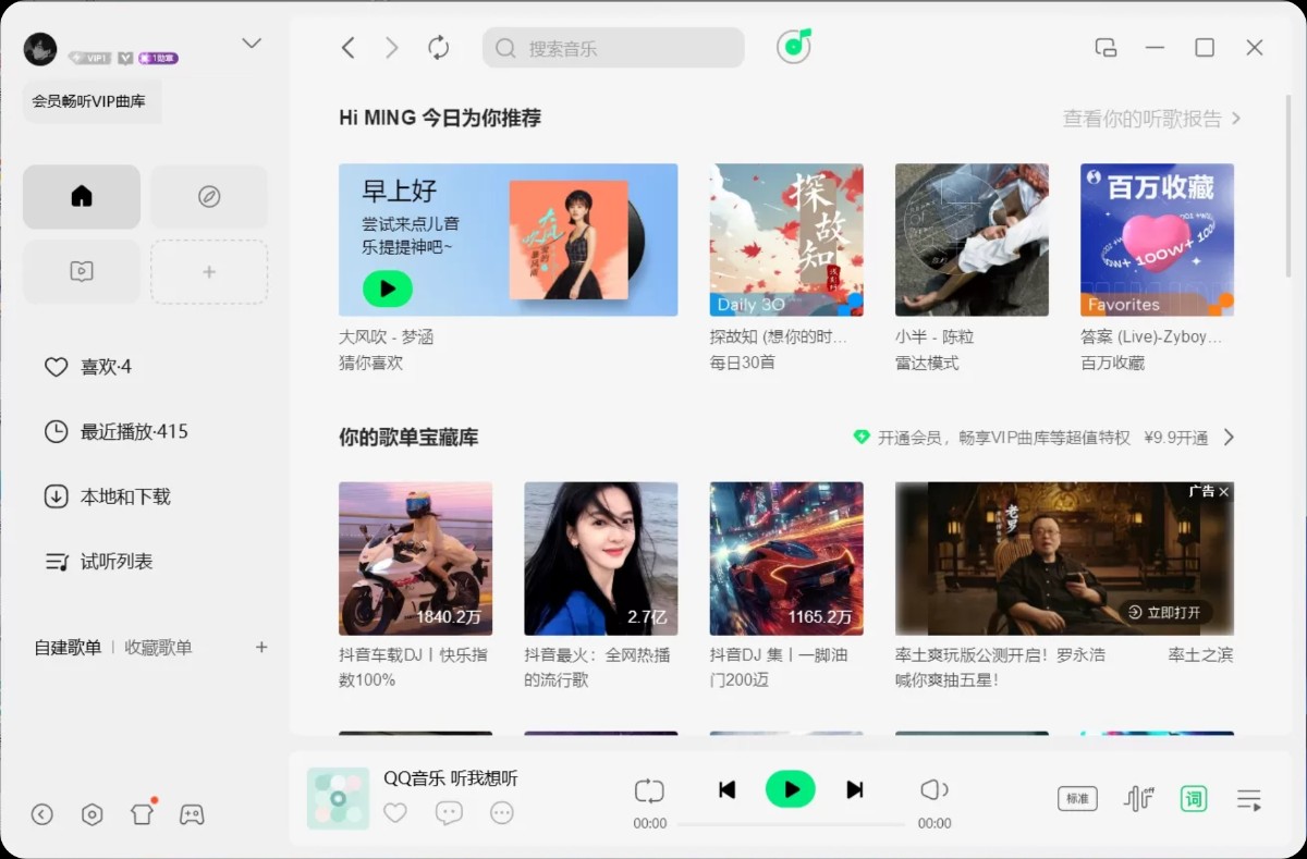 《QQ音乐 v22.10 去广告优化版》,提供 【安装版】与【便携绿色版】两种形态,满足不同用户需求。本版本基于官方 v22.10 深度逆向修改,彻底移除所有商业化干扰,同时保留全部核心功能:5.1声道环绕音效、Super Sound 智能调音、黑胶复古滤镜、歌词实时翻译、听歌识曲、QQ等级加速等一应俱全。