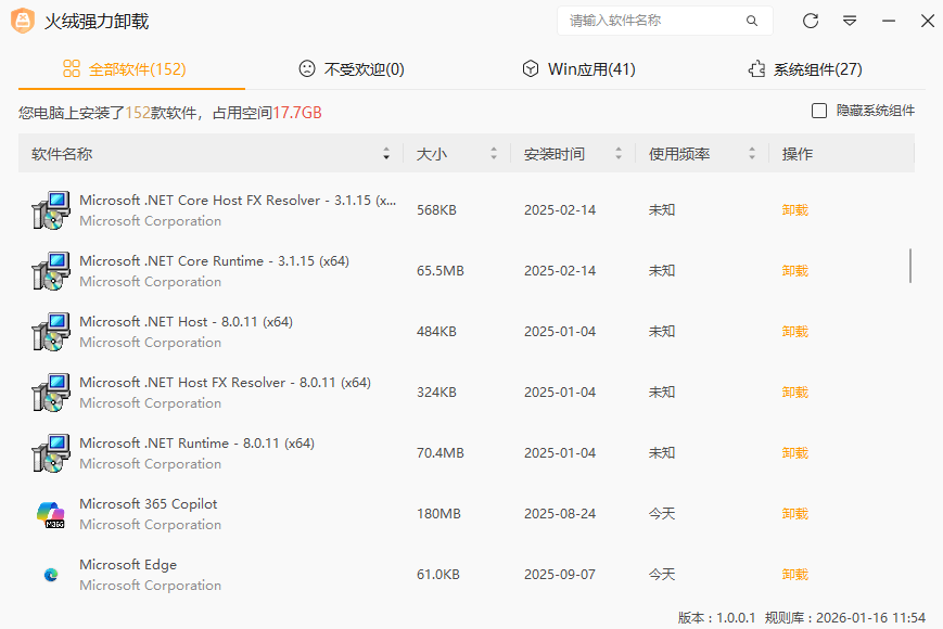 而火绒强力卸载在软件安装时会全程记录行为,后续卸载能精准定位残留,靠 “内置规则库 + 安装行为记录” 双保险,能把卸载后的残留文件、注册表项全扫出来清理干净,彻底释放磁盘空间。